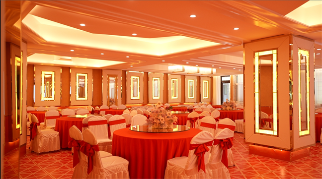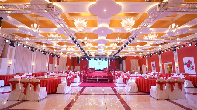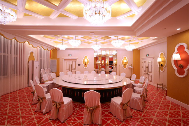 皇宮廳—金碧輝煌、皇宮式裝修,面積1038㎡,層高8.6米,配備愛(ài)情階梯、軌道威亞、二層觀(guān)禮臺(tái)、浪漫燈光秀、旋轉(zhuǎn)升降舞臺(tái)、頭頂天幕連接開(kāi)合大屏。可承接50桌的大型宴會(huì),也可舉辦600人的大型會(huì)議;還可用作會(huì)展、車(chē)展場(chǎng)地,每逢節(jié)假日還為市民上演文藝節(jié)目。